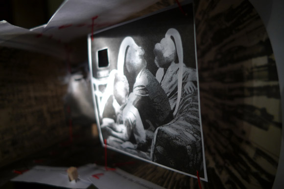 Details: Collage Skulptur; Magazin-Schnipsel, Balsaholz, Faden, Gläser. (11/2013)
